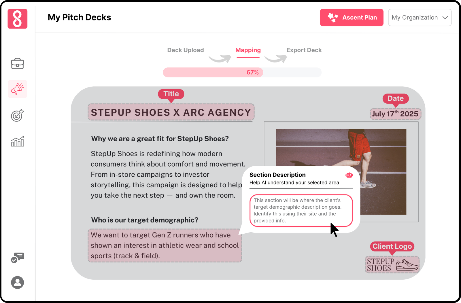 Map key fields like client name, industry, or goals once—Genpitch will autofill them across future decks, saving hours every time you pitch.